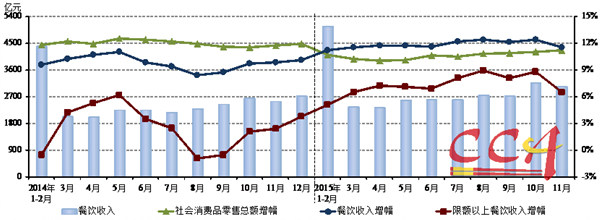 國家統(tǒng)計局日前發(fā)布消費市場最新數(shù)據(jù),11月份,全國餐飲收入3034億元,同比增長11.5%,高于上年同期1.7個百分點;限額以上單位餐飲收入804億元,同比增長6.5%,比上年同期上漲4.1個百分點。單月來看,11月餐飲市場發(fā)展增速大幅回落,餐飲收入增速環(huán)比下跌0.9個百分點,限上餐飲收入更是環(huán)比下跌達2.3個百分點,全國餐飲市場與社會消費品零售總額增幅(11.2%)的差距也縮至0.3個百分點,優(yōu)勢不再明顯。