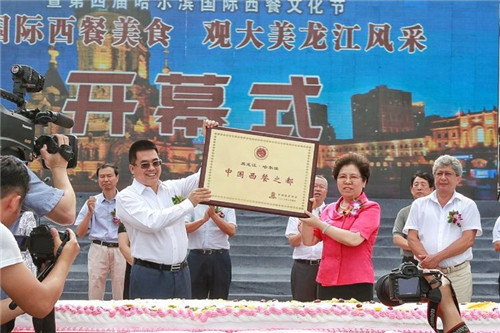 中國飯店協(xié)會會長韓明將“中國西餐之都”牌匾授予哈爾濱市。哈爾濱市市委常委、常務副市長康翰卿接牌。