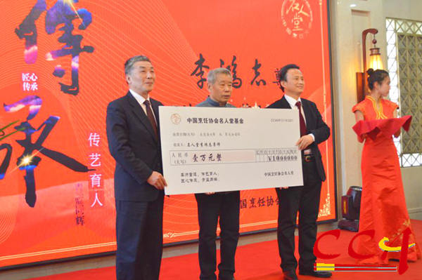 為感謝李鴻志為烹飪行業(yè)師徒傳承做出的巨大貢獻(xiàn),中國(guó)烹飪協(xié)會(huì)喬杰副會(huì)長(zhǎng)及中國(guó)烹飪協(xié)會(huì)名人堂李春祥秘書(shū)長(zhǎng)為李鴻志頒發(fā)了名人堂傳承基金。
