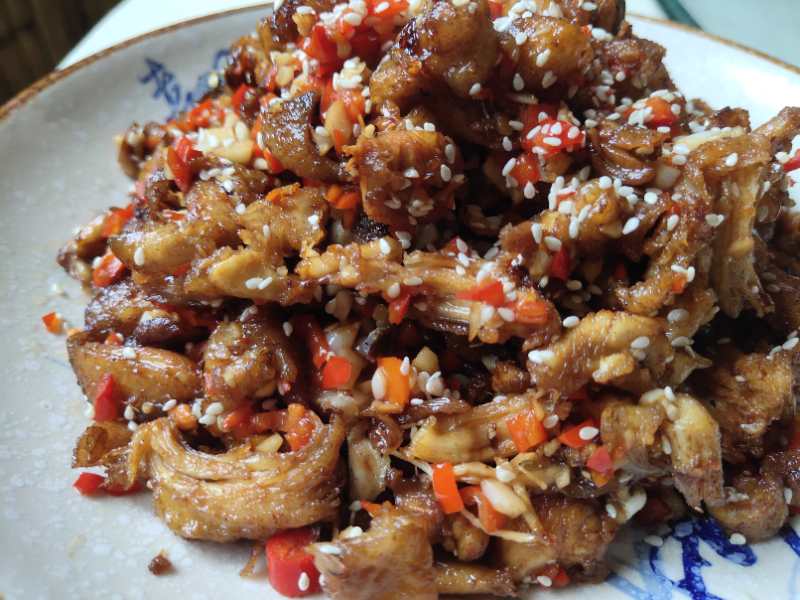 手撕雞炒制的非常入味,肉質(zhì)細膩且富有彈性,肥瘦剛剛好,一口咬下去油花滋飛,剛碰到牙齒,滿嘴都是雞肉的香味,微微嗆喉的辣椒給味蕾帶來了另一番滋味,一切都恰到好處。熱辣的醬汁淌過舌頭直達喉嚨,勁道十足的雞肉在舌尖也留有余香,就連骨頭嚼起來也很有滋味。